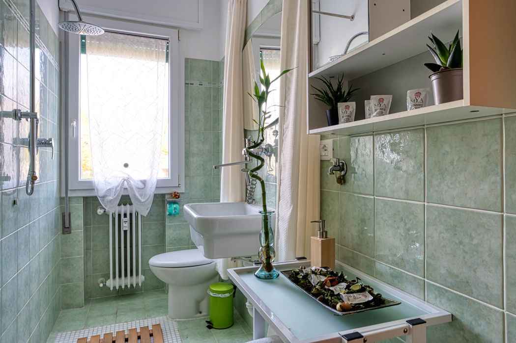 Il bagno emana un'atmosfera serena e rilassante, grazie al suo design minimale e i toni naturali. La grande finestra inonda lo spazio di luce naturale, regalando una sensazione di luminosità e leggerezza. Le pareti rivestite con piastrelle verde oliva conferiscono una tonalità calma e rassicurante, mentre i sanitari e i piani d'appoggio bianchi offrono un contrasto elegante.